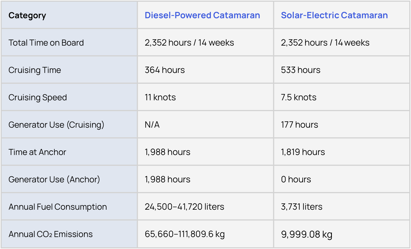 A diesel-powered catamaran emits between 65,660 and 111,809 kilograms of CO₂ annually, compared to just 10.000 kilograms for the solar-electric alternative, showcasing the environmental benefits of renewable energy systems.